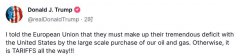 特朗普对欧洲发出“最后通牒”! 12月20日,美国当选总统特朗普对欧盟发出关税威胁称,欧盟必须通过大量购买美国的石油和 天然气 ,来弥补对美国的巨大贸易顺差,不然就会对欧盟...