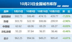 据钢银电商数据显示,截至10月23日,全国钢市总存量为905.41万吨,较上周环比减少43.80万吨(-4.61%),包含40个城市,共计142个仓库。 本周建筑钢材库存总量为439.77万吨,较上周环比减...