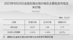 截至9月20日,全国生猪出场价格为16.67元/公斤,比9月13日下跌1.01%;主要批发市场玉米价格为2.90元/公斤,比9月13日下跌1.36%;猪粮比价为5.75,比9月13日上升0.35%。 (文章来源:发改委网...