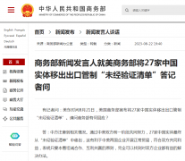 有记者问:美东时间8月21日,美国商务部宣布将27家中国实体移出出口管制“未经验证清单”。请问商务部有何回应? 答:中方注意到相关情况。通过中美双方前一阶段共同努力,27家...