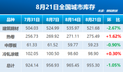 据钢银电商数据显示,截至8月21日,全国钢市总库存量为955.30万吨,较上周环比减少10.15万吨(-1.05%),包含39个城市,共计146个仓库。 本周建筑钢材库存总量为521.68万吨,较上周环比...