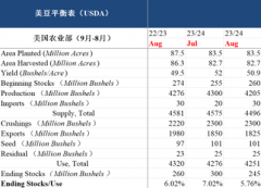 摘要 USDA公布八月供需数据,报告数据中性偏多。美豆2022/23年度旧作平衡表因出口的略微上调导致结转库存由2.55亿蒲上调至2.6亿蒲。2023/24年度新作平衡表,单产由52蒲/英亩下调至50.9蒲...