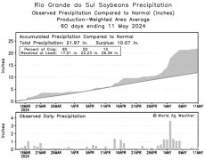 [巴西洪水灾害或致大豆减产] 根据Conab的统计,截至5月5日当周,2023/2024年度巴西大豆收割进度达94.3%,慢于去年同期的95.4%。随着巴西大豆进入收割末期,市场的关注点也转移到了北美...