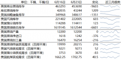 截止6月23日,美国商业原油总库存为45369.0万桶,环比减少960.3万桶,远超预期的减少180万桶,交割地库欣库存增加120.9万桶。战略储备库存下降135.1万桶, 美国能源 部此前计划4月1日-...