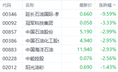 今日石油股再度下挫,截至发稿,延长石油国际(00346.HK)、 中国石油 股份(00857.HK)、 中国石油 化工股份(00386.HK)分别下跌9.59%、2.99%、2.95%。 注:石油股表现 消息面上,周二国际原油期货...