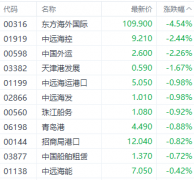 港股航运股今日多数走低,其中 东方海外国际 (00316.HK)、 中远海控 (01919.HK)、 中国外运 (00598.HK)分别下跌4.54%、2.44%、2.26%。 注:航运股表现 消息方面,因需求下滑,波罗的海干散货运...