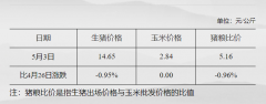 据国家发改委数据,截至5月3日,全国生猪出场价格为14.65元/公斤,较4月26日下跌0.95%;主要批发市场玉米价格为2.84元/公斤,较4月26日持平;猪粮比价为5.16,较4月26日下跌0.96%。 (文章...