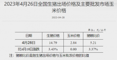 据国家发改委,截至4月26日,全国生猪出场价格为14.79元/公斤,较4月19日上涨3.43%;主要批发市场玉米价格为2.84元/公斤,较4月19日持平;猪粮比价为5.21,较4月19日上涨3.37%。 (文章来...