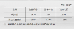 据国家发改委数据,截至4月19日,全国生猪出场价格为14.30元/公斤,比4月12日下跌1.92%;主要批发市场玉米价格为2.84元/公斤,比4月12日下跌0.70%;猪粮比价为5.04,比4月12日下跌1.18%。...