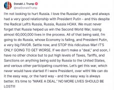当地时间周三,美国总统特朗普再度发出威胁,如果俄罗斯不尽快与乌克兰达成和平协议结束战争,美国将采取更为严厉的制裁措施,还将对俄罗斯商品加征关税。 特朗普当天在社交媒...