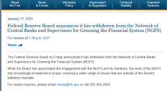 在特朗普即将于下周一正式走马上任之前,他的“拿手绝活”——“退群”,似乎也被美联储学会了…… 美联储周五(1月17日)意外宣布,其已退出央行与监管机构绿色金融网络(NGFS),该...