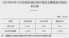 据国家发改委数据,截至4月12日,全国生猪出场价格为14.58元/公斤,比4月5日下跌1.35%;主要批发市场玉米价格维持在2.86元/公斤;猪粮比价为5.10,比4月5日下跌1.35%。 (文章来源:国家...