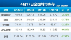 据钢银电商17日公布的数据,截至4月17日的一周,全国39个城市,共计146个仓库城市钢铁总库存量为1088.75万吨,环比减少28.09万吨,降幅2.52%。 其中,建筑钢材(包含30个城市,共计85个...