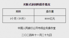 公开市场买断式逆回购业务公告 [2024]第2号 为维护 银行 体系流动性合理充裕,2024年11月人民 银行 以固定数量、利率招标、多重价位中标方式开展了8000亿元买断式逆回购操作。具体情...