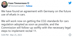 德国和欧盟委员会上周六(3月25日)达成一项协议,欧盟将允许合成燃料汽车在2035年后继续销售使用。 欧盟委员会副主席蒂默曼斯(Frans Timmermans)在推特上写道,“我们已经与德国就未来汽...