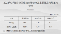 据国家发改委数据,截至3月8日,全国生猪出场价格为15.87元/公斤,比3月1日上涨0.13%;主要批发市场玉米价格为2.92元/公斤,较3月1日持平;猪粮比价为5.43,比3月1日持平。 (文章来源...