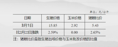 据国家发改委数据,截至3月1日,全国生猪出场价格为15.85元/公斤,比2月22日上涨2.59%;主要批发市场玉米价格为2.92元/公斤,较2月22日持平;猪粮比价为5.43,比2月22日上涨2.65%。 (文章...