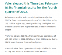 淡水河谷 公司16日发布报告称,2022年第四季度来自持续经营产生的调整后EBITDA为50亿美元,季环比增加10亿美元,主要是因为铁矿石销量增加,以及镍和铜价格上涨;形式上来自持续经...