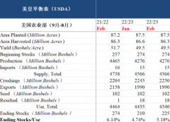 摘要 USDA公布二月供需数据,报告数据偏中性。本次报告中美国新作供应端数据未作调整,需求端数据,压榨由22.45亿蒲式耳下调至22.3亿蒲式耳,结转库存由2.1亿蒲式耳上调至2.25亿蒲式...