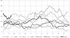 自2023年9月起,甲醇 2405合约在23002550元/吨横盘振荡已持续了一个季度以上。而春节前夕,盘面再度冲高至2500元/吨以上,春节前最后一个交易日的持仓量虽有缩减,但甲醇作为节前盘面...
