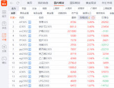 国内期货 主力 合约大面积上涨,沪锡、铁矿石、 苹果 、PTA涨超3%,短纤、纯碱涨超2%。跌幅方面,菜籽油跌近2%。 来源: 东方财富 期货 (文章来源:财联社)...