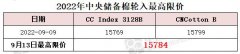 9月13日中央储备棉轮入上市数量 6000 吨,无成交。 根据《关于2022年第一批中央储备棉轮入的 公告 》,轮入竞买最高限价(到库价格)按前一个工作日国内棉花现货价格动态确定,并设置...