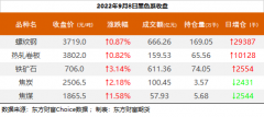 截至9月8日收盘,螺纹钢2301收3719元/吨,涨0.87%;热卷2301收3802元/吨,涨0.82%;铁矿石2301收706元/吨,涨3.14%;焦炭2301收2506.5元/吨,涨2.18%;焦煤2301收1865.5元/吨,涨1.58%。 螺纹钢2301合约...