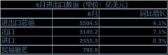 9月7日,海关总署发布的数据显示,今年前8个月中国 进出口 总值4.191万亿美元,同比增长9.5%。其中,出口2.375万亿美元,同比增长13.5%;进口1.815万亿美元,同比增长4.6%;贸易顺差560...