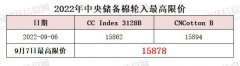 9月7日中央储备棉轮入上市数量6000吨,无成交。 根据《关于2022年第一批中央储备棉轮入的 公告 》,轮入竞买最高限价(到库价格)按前一个工作日国内棉花现货价格动态确定,并设置启...