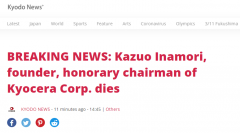 据日本共同社刚刚消息,日本著名实业家稻盛和夫去世。 相关报道: 日本“经营之圣”稻盛和夫 去世终年90岁 综合日本朝日电视台、NHK 8月30日消息,著名实业家、京瓷名誉会长、被称...