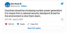 全球首富、 特斯拉 首席执行官埃隆·马斯克日前再次倡导核能。他呼吁各国增加核能发电,并表示关闭核电站是疯狂之举,将危及国家安全和环境,某些主张关闭核电站的环保人士是“...