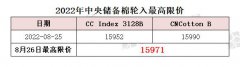 8月26日中央储备棉轮入上市数量6000吨,无成交。 相关报道: 中央储备棉轮入最高限价为15971元/吨(8.26) 根据《关于2022年第一批中央储备棉轮入的 公告 》,轮入竞买最高限价(到库价格...