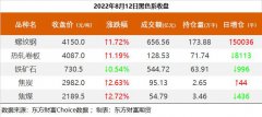 截至8月12日收盘,螺纹钢2210收4150元/吨,涨1.72%;热卷2210收4087元/吨,涨1.19%;铁矿石2301收730.5元/吨,跌0.54%;焦炭2209收2982元/吨,涨2.63%;焦煤2209收2189.5元/吨,涨2.72%。 螺纹钢2210合约...