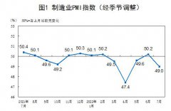 一、中国制造业采购经理指数运行情况 7月份,制造业采购经理指数( PMI )为49.0%,比上月下降1.2个百分点,位于临界点以下,制造业景气水平有所回落。 从企业规模看,大、中型企业...