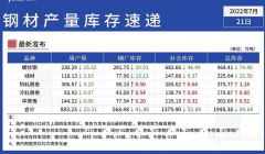 据Mysteel,截至7月21日当周,产量连续第六周减少,社库连续第五周减少,厂库连续第四周减少,表需由降转增。 ①螺纹产量230.29万吨,较上周减少15.32万吨,降幅6.24%; ②螺纹厂库28...