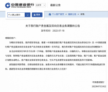 7月18日,中国 建设银行 官网发布 公告 称,自北京时间2022年8月15日(周一)7:00起,暂停账户 贵金属 业务黄金、白银的买入、转换交易及 定投 计划的设置与变更;暂停账户 贵金属 双向...