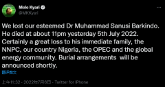 当地时间周三(7月6日),尼日利亚国家石油公司通过 推特 发布消息,石油输出国组织(欧佩克)秘书长穆罕默德·萨努西·巴尔金多(Muhammad Sanusi Barkindo)于周二(7月5日)23:00去世,享年63岁。...