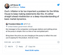 美国总统拜登周末发推喊话,要求加油站营运商降价,却招致 亚马逊 创始人、当前的世界第三大富豪贝佐斯批评其“误导大众,不懂市场规律”。 “这是一个冲突和全球危机的时期,...