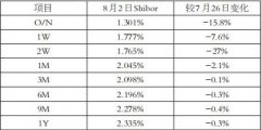 受月末资金需求高峰结束以及市场整体资金需求疲软的影响,本周国内市场利率呈现全面下降态势。截至8月2日,上海银行间同业拆放利率(Shibor)隔夜、1周期、2周期、1月期、3月期、...