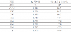 本周国内市场利率呈现短强长弱的态势。一方面,临近月中和年底,月中缴税、缴款压力增加,年底资金需求上升,使得短期利率开始走强;另一方面,国内资金供大于求格局未变,中...