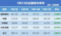 新华财经北京9月23日电钢银电商23日公布最新数据显示,截至9月23日的一周,全国39个城市,共计147个仓库的城市钢材总库存量为845.81万吨,较上周环比减少24.49万吨(-2.81%)。 其中,建...