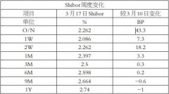 受季末资金需求上升的影响,上周国内中短期利率大幅上升。截至3月17日,上海银行间同业拆放利率隔夜、1周、2周、1月、3月、6月期利率分别报收于2.262%、2.086%、2.262%、2.397%、2.5%、...