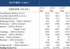 摘要 USDA公布九月供需数据,数据中性。本次报告中,2023/24年度旧作平衡表作出细微的调整,上调压榨至22.95亿蒲,结转下调至3.4亿蒲。2024/25年度新作平衡表中,单产、面积、出口、压...