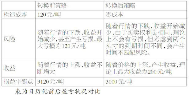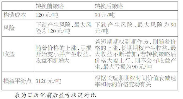 显然,考虑到短期期权30元/吨权利金的收益,长期期权持仓成本由120元/吨下降到90元/吨,这大大降低了风险。同时,在不同标的资产价格表现下,日历化产生了两种效用:一方面,它保留了赚取行情利润的可能性,若短期期权到期作废,则持仓只剩下长期期权,若此时价格大幅上行,收益会随着标的价格上行而不断增加;另一方面,日历化给组合整体带来了特殊的时间风险,若短期期权有效期内标的价格大幅上行,此时不会有收益产生,但最大亏损将被限制在90元/吨。