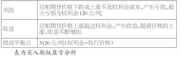 假设当豆粕期货价格为3000元/吨时,投资者买入1手三个月到期、执行价格为3000元/吨的豆粕平值看涨期权Call@3000,付出权利金120元/吨,其风险收益如下表所示: