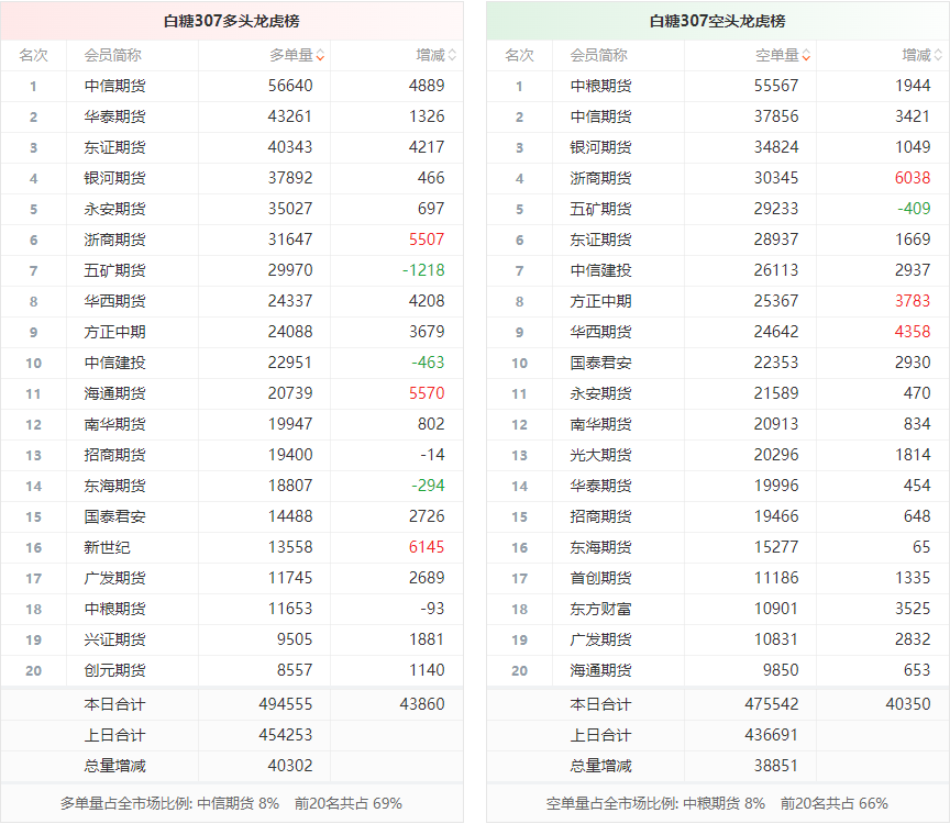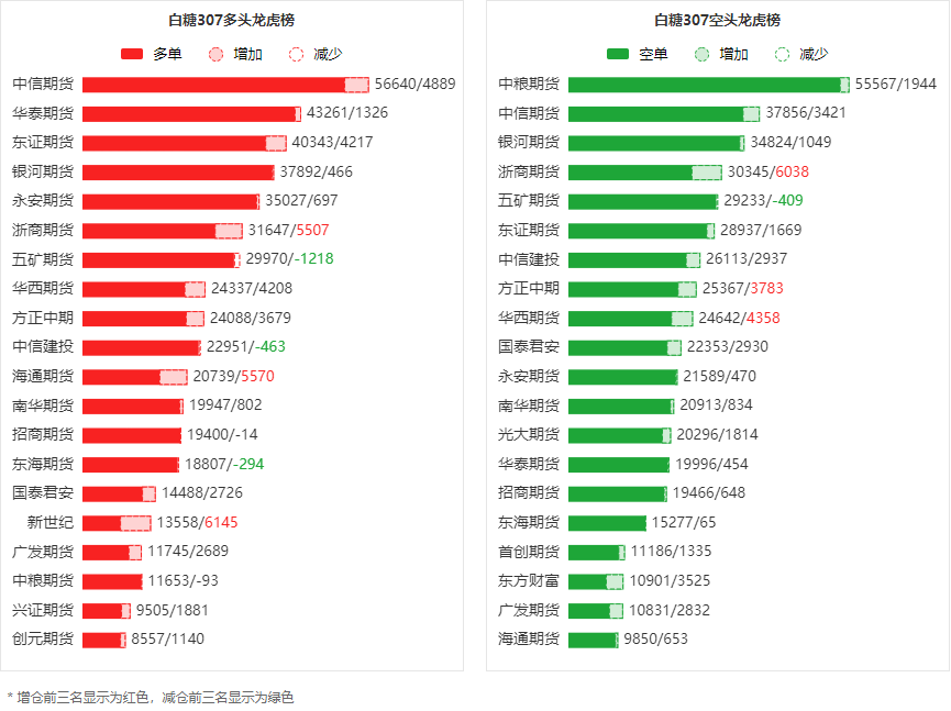 周五白糖主力合约收涨3.35%,收盘报6719元/吨。 当日持仓为718899手,较前一交易日增加80504手。 日内资金流入9.12亿元,成为当日获得资金流入量最大的商品主力合约。 多空持仓:今日前20席多头持仓494555手,共占全市场69%,其中多头第一名中信期货占全市场8%。 前20席空头持仓475542手,共占全市场66%,其中空头第一名中粮期货占全市场8%。 前20席整体呈净多19013手,较前一交易日的净多17562手增加1451手。 ![]() 净仓趋势:下图可以看出,前20席位净持仓最近由空转多。 ![]() 持仓动向:就多头而言,今日前20席较前一日增仓43860手,其中新世纪、海通期货、浙商期货增仓明显,三机构分别增仓6145手,5570手和5507手。 就空头而言,今日前20席较前一日增仓40350手,其中浙商期货、华西期货、方正中期增仓明显,三机构分别增仓6038手,4358手和3783手。 ![]() 盈亏剖析:数据显示,一周内中金期货、国投安信、海通期货在白糖上盈利居前,三机构分别盈利3491.63万元,3175.82万元,2161.31万元。 ![]() 一周内中粮期货、光大期货、瑞银期货在白糖上亏损居前,三机构分别亏损11269.38万元,2996.64万元,2467.53万元。 ![]() 总体而言,白糖307合约今日增仓上行,多空持仓排名前20席中,多空双方均呈进场态势,多头进场意愿强于空头。 注:可通过点击东方财富期货PC端左侧“龙虎榜”栏目及东方财富期货APP行情页面“龙虎榜”栏目查看各类机构持仓及盈亏榜单信息。 ![]() ![]() (文章来源:东方财富研究中心) (责任编辑:admin) |