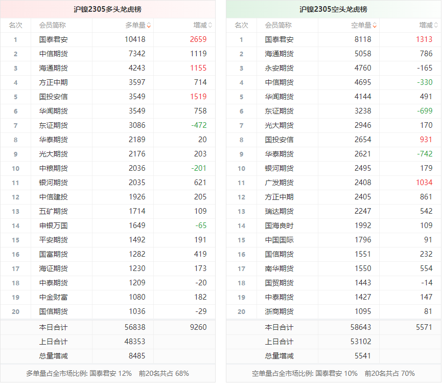 周五沪镍主力合约收涨3.39%,收盘报179300元/吨。 当日持仓为83751手,较前一交易日增加8276手。 日内资金流入4.64亿元。 多空持仓:今日前20席多头持仓56838手,共占全市场68%,其中多头第一名国泰君安占全市场12%。 前20席空头持仓58643手,共占全市场70%,其中空头第一名国泰君安占全市场10%。 前20席整体呈净空1805手,较前一交易日的净空4749手增加2944手。 ![]() 净仓趋势:下图可以看出,前20席位净持仓较长时间内处于净空态势。 ![]() 持仓动向:就多头而言,今日前20席较前一日增仓9260手,其中国泰君安、国投安信、海通期货增仓明显,三机构分别增仓2659手,1519手和1155手。 就空头而言,今日前20席较前一日增仓5571手,其中国泰君安、广发期货、国投安信增仓明显,三机构分别增仓1313手,1034手和931手。 ![]() 盈亏剖析:数据显示,一周内五矿期货、中信期货、银河期货在沪镍上盈利居前,三机构分别盈利1192.34万元,905.94万元,793.37万元。 ![]() 一周内国海良时、南华期货、中信建投在沪镍上亏损居前,三机构分别亏损1958.29万元,1213.56万元,1029.11万元。 ![]() 总体而言,沪镍2305合约今日增仓上行,多空持仓排名前20席中,多空双方均呈进场态势,多头进场意愿强于空头。 注:可通过点击东方财富期货PC端左侧“龙虎榜”栏目及东方财富期货APP行情页面“龙虎榜”栏目查看各类机构持仓及盈亏榜单信息。 ![]() ![]() (文章来源:东方财富研究中心) (责任编辑:admin) |
