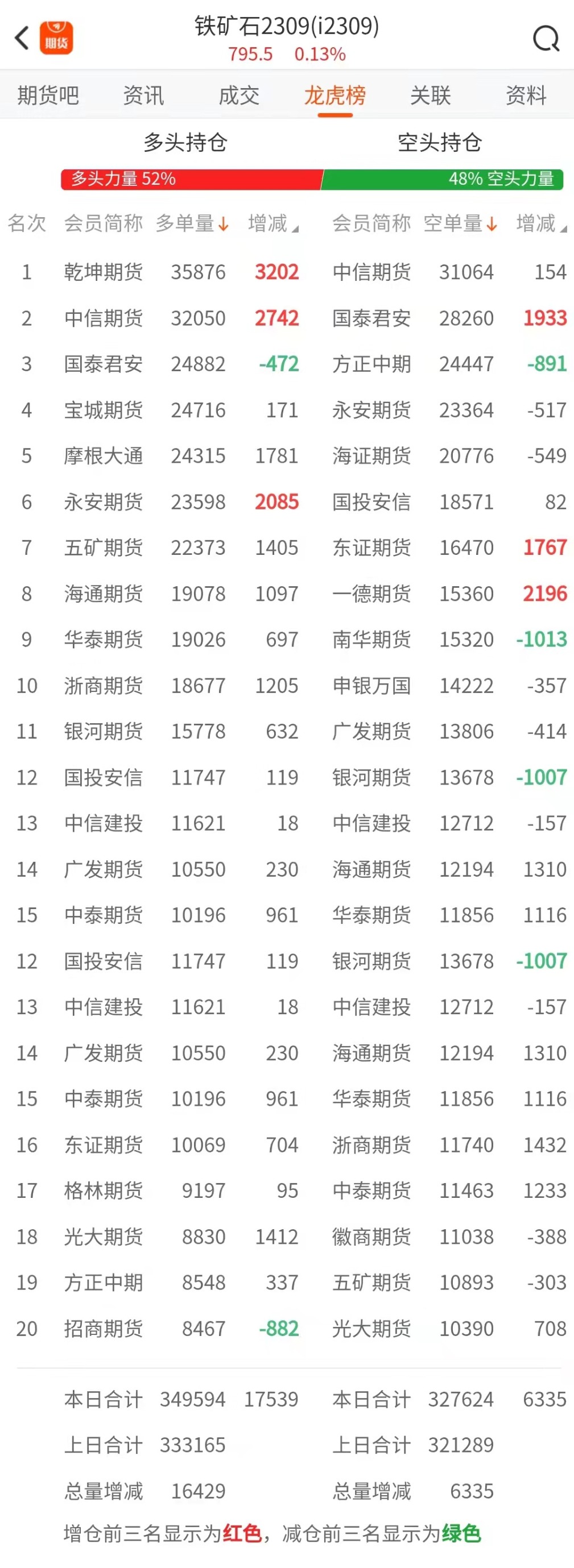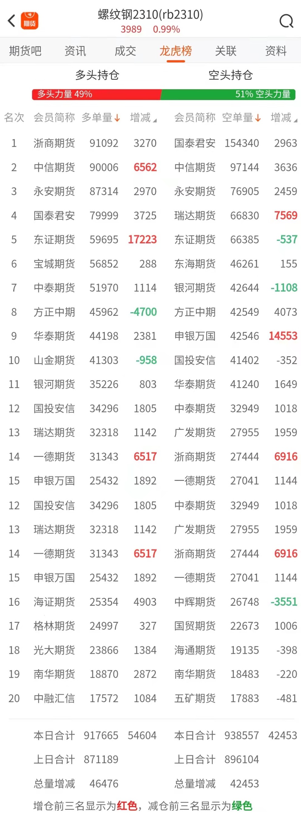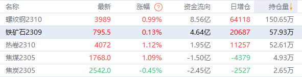 截至4月7日收盘,螺纹钢2310收3989/吨,涨0.99%;热卷2310收4072/吨,涨1.12%;铁矿石2309收795.5元/吨,涨0.13%;焦炭2305收2542/吨,跌0.45%;焦煤2305收1768元/吨,涨1.09%。 螺纹钢2310合约前20席位多单增仓54604手至91.7万余手,空单增仓42453手至93.8万余手。其中,东证期货多单增持17223手,空单减持537手,整体呈净空6690手。 各品种具体如下: ![]() 各品种持仓情况具体如下: ![]() ![]() ![]() ![]() ![]() 注:可通过点击东方财富期货PC端左侧“龙虎榜”栏目及东方财富期货APP行情页面“龙虎榜”栏目查看各类机构持仓及盈亏榜单信息。 ![]() ![]() (文章来源:东方财富研究中心) (责任编辑:admin) |