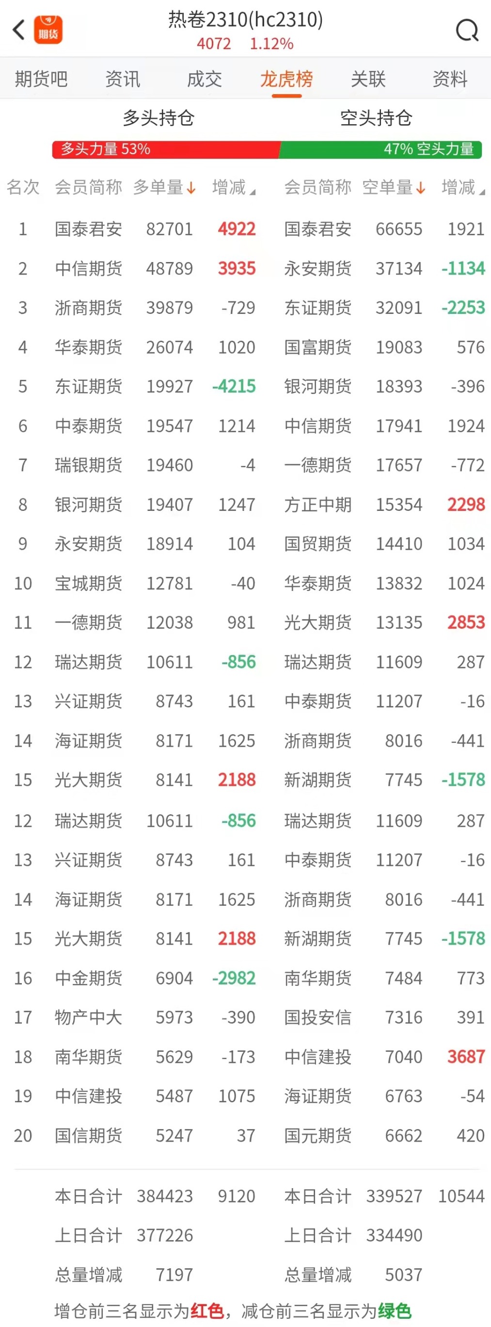 黑色持仓龙虎榜:热卷涨1.12% 空头第五名增持超1.7万手螺纹多单
