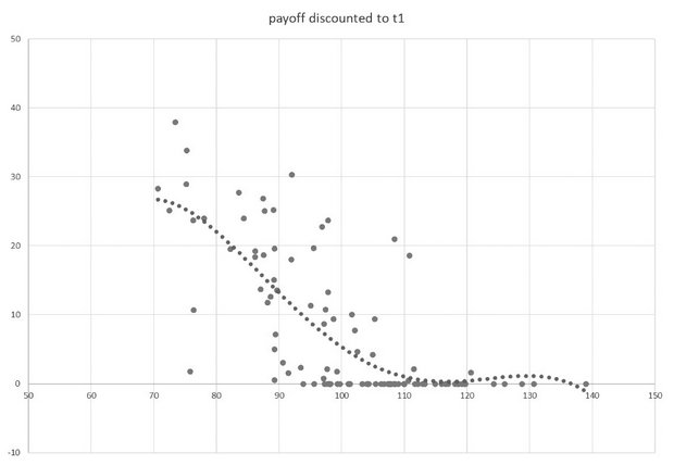 图为t1时刻标的模拟价格与继续持有期权的期望收益的散点表现